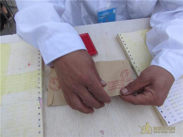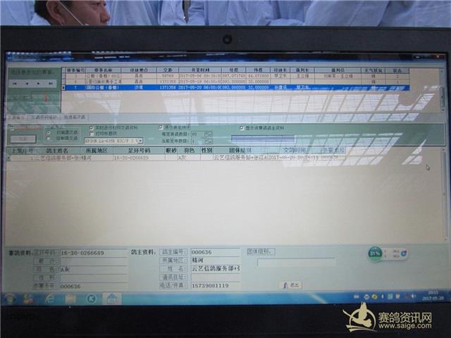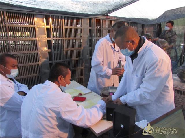 新疆飞天大爱公棚2017年春棚200公里首关赛集鸽现场,裁判认真核对赛鸽信息和盖“暗码章”