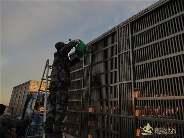 新疆飞天大爱公棚2017年春棚200公里首关赛放飞现场,公棚工作人员在做放飞前的准备工作