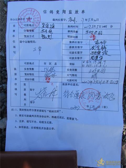 监放单位:新疆奎屯市信鸽协会