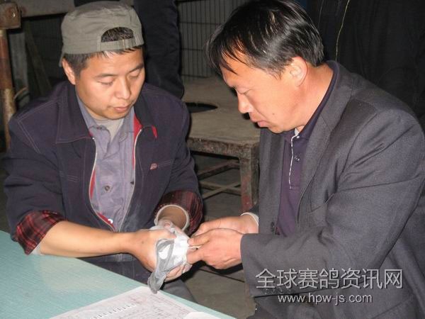 乌鲁木齐市米东区三关赛首关赛j集鸽现场,裁判在认真的核对赛鸽的足环号码、羽色