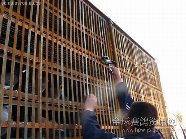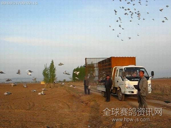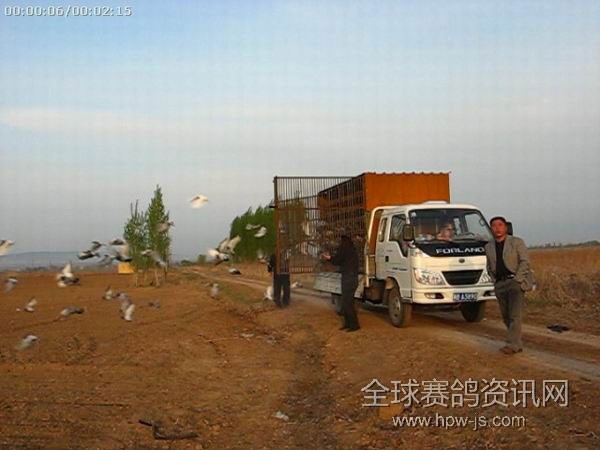 新疆奇台绿州公棚09年春季300km预赛放飞现场,赛鸽冲出赛鸽车