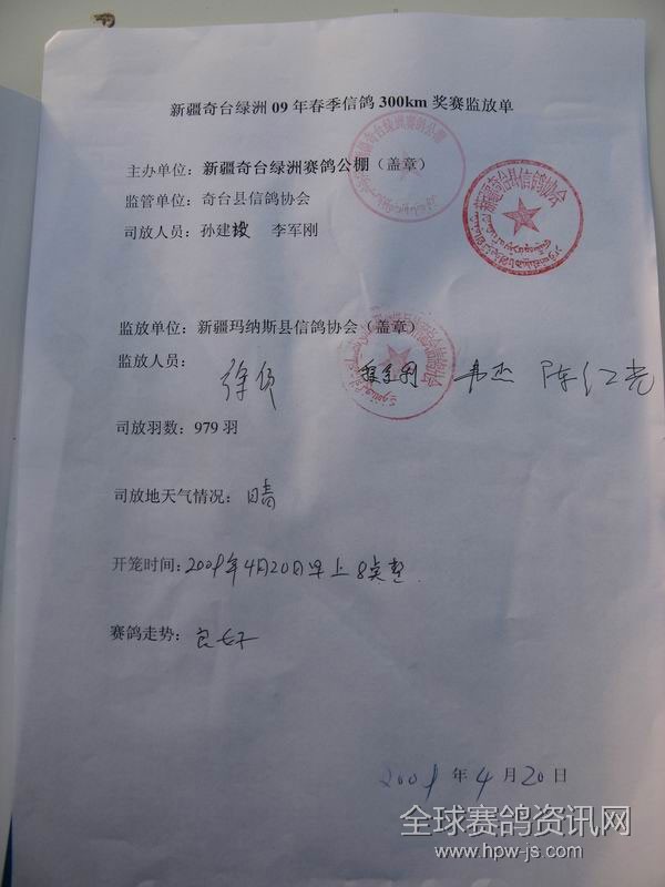 新疆奇台绿州公棚09年春季300km预赛放飞现场,监放单位:新疆玛纳斯县信鸽协会裁判