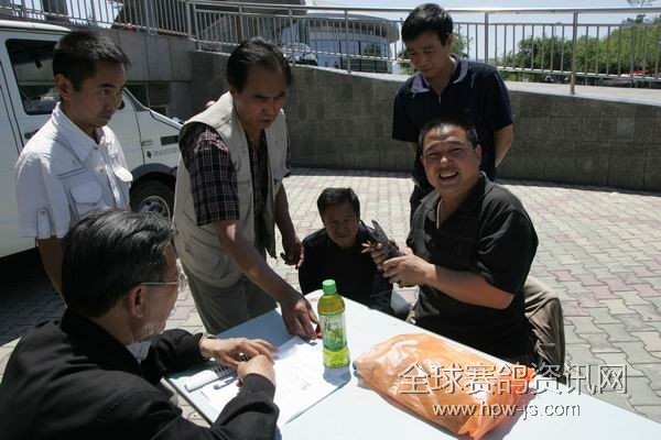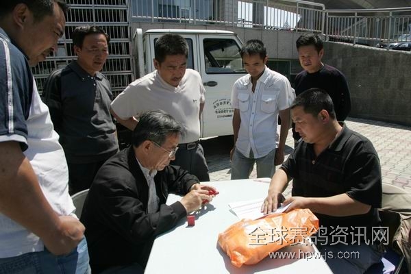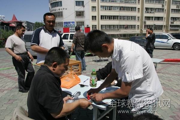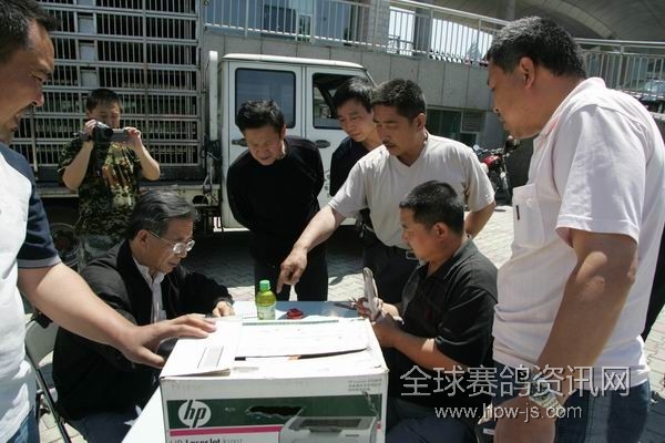 乌鲁木齐勇翔赛鸽俱乐部现场,裁判们认真的核对赛鸽信息