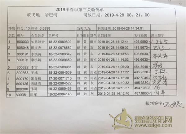 新疆泓飞振翔赛鸽俱乐部2019年春季四关赛第三关前十名鸽主 举办单位:新疆泓飞振翔赛鸽俱乐部 比赛时间:2019年春季四关赛第三关 监督单位:全体参赛鸽友 裁判员:孙建设(国家一级裁判) 方小东 刘勇 等