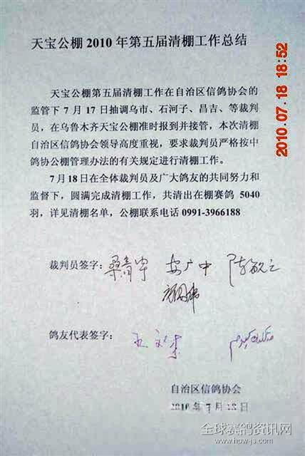 新疆天宝赛鸽公棚2010年第五届清棚名单
