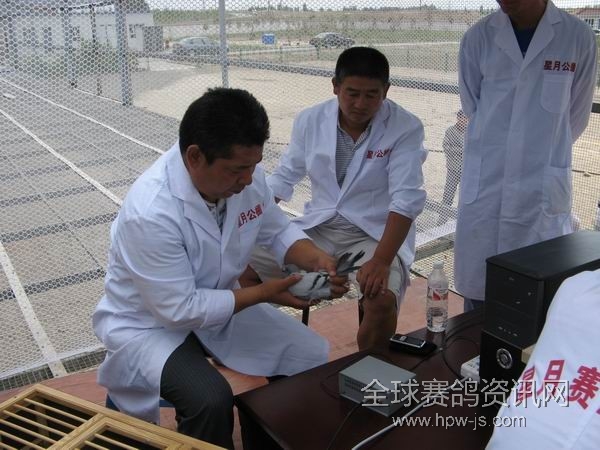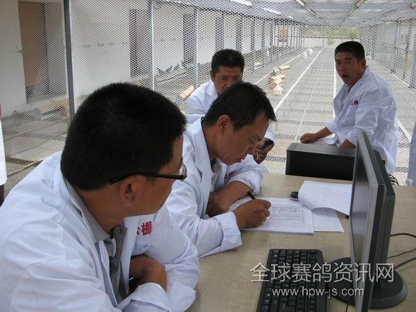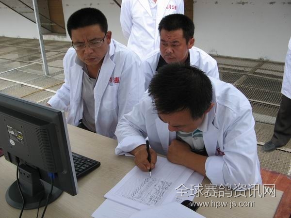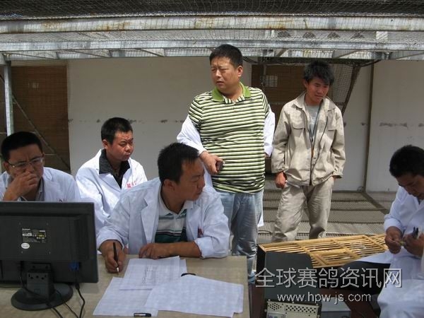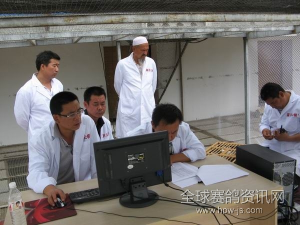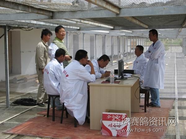 新疆星月赛鸽公棚2010年首届幼鸽公棚赛清棚现场——裁判进行手工与计算机同步记录