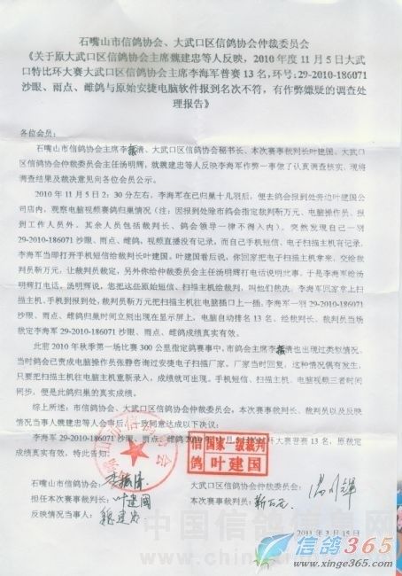 信鸽协会主席李海军普赛13名,环号:29-2010-186071沙眼、雨点、雌鸽与原始安捷电脑软件报到名次不符,有作弊嫌疑的调查处理报告》