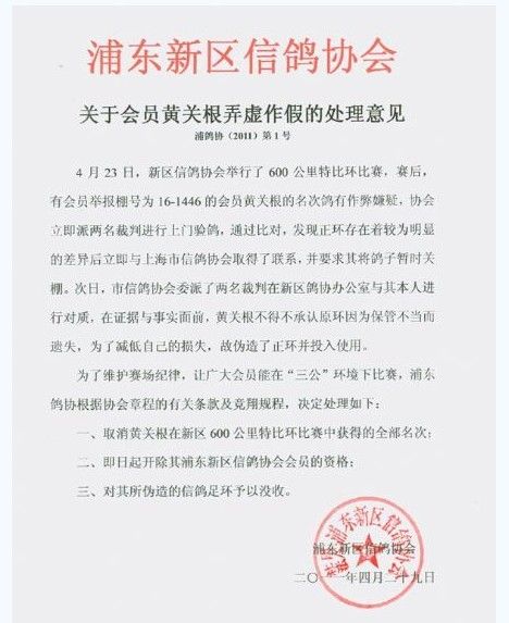 上海市信鸽协会同意浦东新区鸽协对黄关根会员伪造足环,弄虚作假行为的处理意见。为保持比赛的纯洁性,营造公平竞赛氛围,提高信鸽竞赛水平,必须加大对一切弄虚作假,干扰比赛正常进行的现象予以坚决打击,严肃自理。