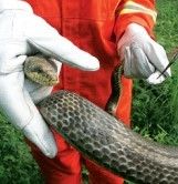 6月21日17时许,丹东消防特勤中队接调度室报警称,七道小学对面居民家中发现三条大蛇,威胁着附近群众的生命安全,请求中队前去援助。 接警后,中队迅速派出1辆抢险救援车共5名指战员赶赴现场。 官兵们赶到小区时,在场群众将官兵带到了该居民家的门口。官兵们发现,三条长近一米半,直径4厘米的大蛇正缠绕在窗户的防盗网上,吃着居民家中的鸽子。 为了保证居民的生命安全,中队指挥员下令捕捉工作立即展开——一名战士担当捕蛇者,做好全面防护措施后,该名战士手持一把长钳慢慢接近大蛇,大蛇张开大嘴咬住了长钳,消防员试图将它夹到蛇皮袋内,可蛇却用身体死死缠住防盗网不放。 这时候,消防员猛的一用力向下拉夹住蛇的长钳,狡猾的蛇又突然放松了缠在防盗网上的身体,令消防员打了个趔趄,大蛇顺势掉到了地面,在场的居民都惊呼着急忙后退。 随后,掉到地上的大蛇试图沿墙溜走,消防员王朝兴察觉情况后,一个箭步上前,一脚踩住大蛇的颈部,右手一把掐住蛇头,另一只手抓住蛇身,大蛇被制伏,消防员们将它装进早已准备好的蛇皮袋内。 紧接着,消防官兵用此方法将其余两条大蛇也抓进蛇皮袋内。之后,出于对动物的保护,官兵们来到远离喧嚣、人烟稀少的五龙背附近,把捕捉到的三条大蛇放生。 事后,户主告诉记者,由于家中养鸽子和鸡等,受到大蛇多次“光临”。