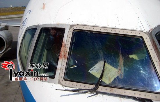被撞飞机雨刮器留下了鸽子的血迹。亚心网记者 张军 摄