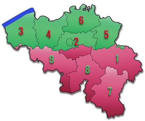 你了解了以上情况,当你买一羽比利时鸽子时,如果他是省第一名(或鸽王)除了考虑是否是那一省的专长外,你要知道,有的省的养鸽人数(和鸽量相关)是另一省的5倍、10倍、100倍甚至是200倍。它的含金量有极大的不同。图中红色区为法语区,绿色区为菏语区。