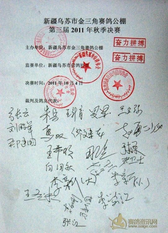 裁判单位及鸽友代表:新疆乌苏市信鸽协会、 新疆石河子信鸽协会、新疆昌吉州信鸽协会、赛鸽资讯网驻新疆记者(孙建设)、新疆各地区鸽友等。