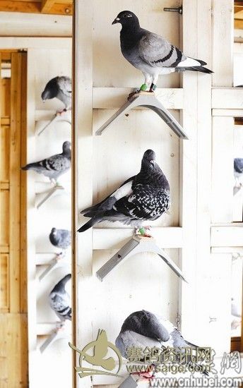 图为:鸽笼里专为赛鸽装备站立架