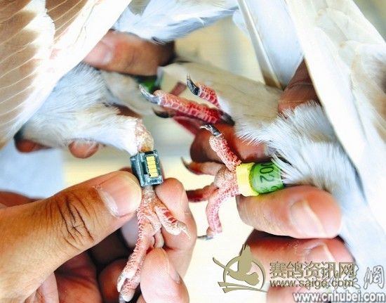 图为:每只赛鸽脚上都有条码和芯片