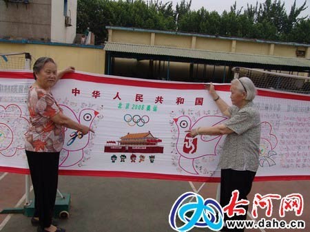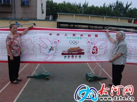 90岁的张老太讲述祖国在我们心中 2008只和平鸽,将载着13万铝城儿女的祝福,飞向北京迎奥运。 一幅布满2008只和平鸽的奥运锦绣图,是上街区济源路办事处商业街社区李书成一家送给2008北京奥组委的礼物。这幅奥运锦绣图是由李书成90岁的岳母、80多岁的母亲和其家人共同设计和手工绣制的,主体工程即将完工,完工后将送给北京奥组委。 突发奇想 九旬老人要为2008奥运会备礼 2001年7月13日,当中央电视台播放北京申奥成功的消息时,举国欢庆。八年的申奥之路终成“正果”,具有一百多年历程的奥运盛会,终于能在中国举办,奥运圣火能在北京点燃,李书成心里无比兴奋,感到祖国之伟大,作为普通老百姓我们能为奥运会做点什么呢? 这个想法一直在他心中时隐时现,直到今年春节过后,一次看到妻子在鞋垫上绣图案时,他突发奇想,能不能用妻子的手艺为奥运会绣上一幅画卷,为奥运献一份礼物呢?经过几天构思后,他把想法告诉了妻子后,得到妻子的大力支持,因为工程比较大,李书成就和几个姊妹在一起对方案进行了反复推敲,确定了实施方案,并且还进行了分工,便开始了紧锣密鼓地准备,收集资料,购置材料,仅用了半月时间就完成了准备工作。 东上杭州买刺绣所用的线,在上街扯好要用的白色绸布。难度最大的工作是设计和平鸽的姿态,为了使和平鸽的姿态迥异,各不相同,李书成两天两夜没有睡觉,手工画好鸽子的图案,最后在篆刻店刻印了140种不同鸽子的图章。截至目前,主体工程已经完成70%,预计今年9月份能够完工。 祖孙三代共绣奥运锦绣图 这幅奥运刺绣图是以2008奥运会为主题,祖孙三代8人共同参与绣制。 全长2008厘米,象征着北京2008年奥运会,宽90厘米,总共分为31个部分,用刺绣的手法在白色锦缎上共绣姿态各异、色彩不同的和平鸽2008只,锦绣图上清晰可见每一届承办奥运会的国家名称、举办时间及地点。 这么浩大的工程,背后渗透着祖孙三代9个家庭的心,90岁的岳母也参与这样大的家庭会战,每天坚持绣4只鸽子,老人的8个女儿有6个参与过这项家族工程,女婿、外孙女受老人感化也参加进来,就连平时从没有做过饭的女婿也做起了厨师,以实际行动支持此项工程。