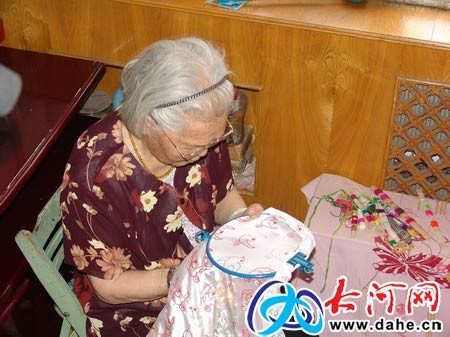 90高龄的张老太认真刺绣