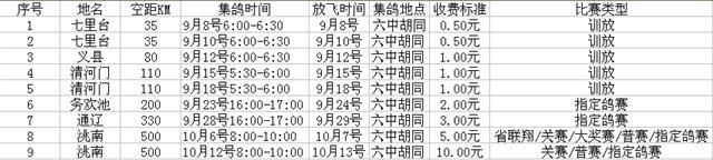 2007年秋葫芦岛市信鸽协会训放比赛时间表