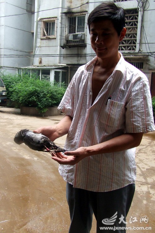 范先生手捧死去的信鸽表情黯然 本报讯见习记者金路遥、实习生龚广兴摄影报道:11日上午,在新建县兴华路15号开店的范红喜手捧一只死去的信鸽,表情有些黯然。范红喜不忍心将死去的信鸽扔掉,希望能找到它的主人,给它一个安息的地方。 范红喜说,9日晚上,他在建材店的后院里发现这只灰色的鸽子,当时它被两只老猫夹在中间,尾巴被咬得鲜血淋漓,范红喜急忙从猫口里夺下了它。随后,他用一个小纸箱做成了一个鸽笼,让它在里面疗伤。这只鸽子左右脚各有一个红色的脚环,左脚上面有“CHN2007-14,110727”的字样,右脚则写着“大奖110727”。原来,这是一只迷途的信鸽。 当晚,帮信鸽止住伤口的血后,范红喜便拿来米饭和水喂它,但整个晚上信鸽都不吃不喝,眼神看上去有些忧郁。10日下午,范红喜再打开箱子时,发现信鸽已经死去多时。 范红喜说,这几天他会将信鸽的尸体保存好,希望主人看到报道后及时与他联系。