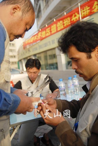 工作人员在检查、登记鸽子的“身份证” 每场比赛前100名计算积分,积分办法第一名100分,第二名99分,第三名98分,依次类推,第100名1分。每站比赛按以上办法累计积分,总决赛后,按四站积分总和排出乌鲁木齐地区前十名年度鸽王。