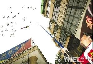 每天晚上,北京展览馆东侧一家店铺内的店员小王都会举起一根绑着布条的长鱼竿,满天“挥舞”轰赶天上的鸽群。据他说,这是在让鸽子们“锻炼体能”。