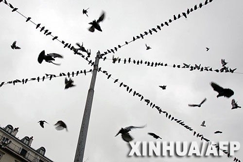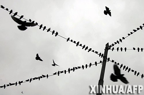 11月29日,在瑞士日内瓦市的一个公园,鸽子排排“坐”在电线上。