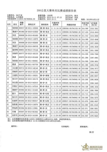 2012年11月1号300公里大赛单关成绩表(1-25名)