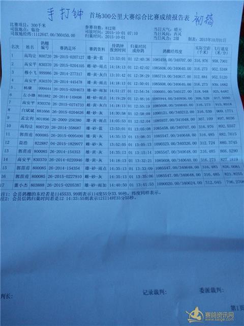 2015年秋季东北线首场300公里手打钟综合比赛成绩报告单初稿