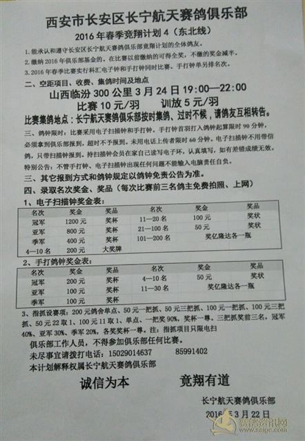 俱乐部决定,3月23日晚训放80公里荆姚,每羽1元,各集鸽地点和时间不变,集鸽时领取新表,24日300公里比赛集鸽,请鸽友相互转告。