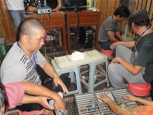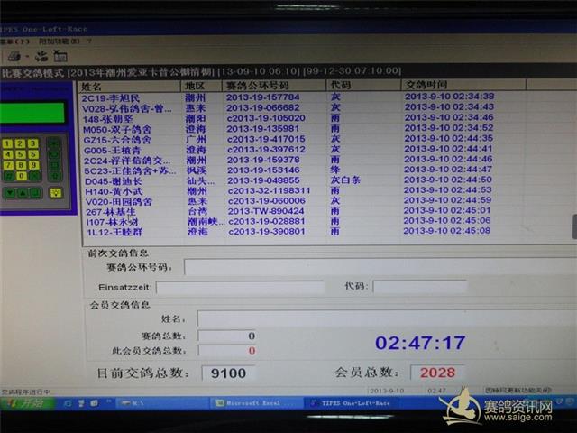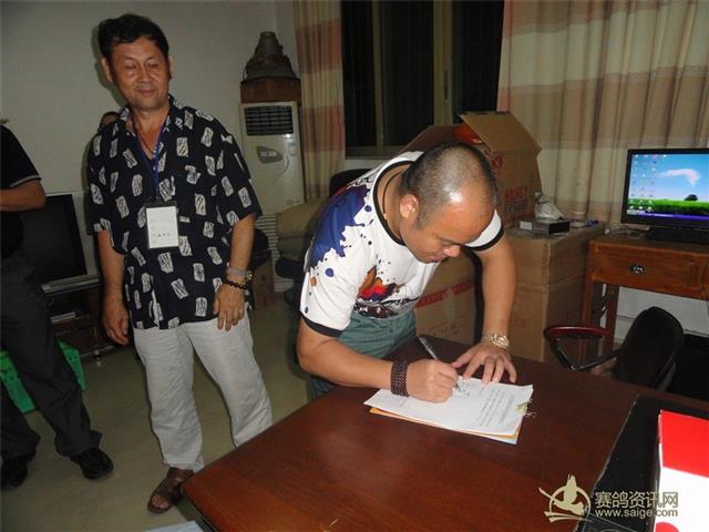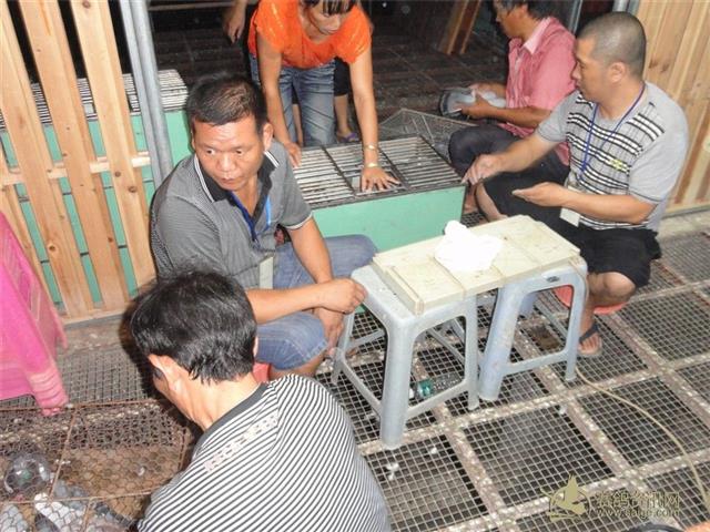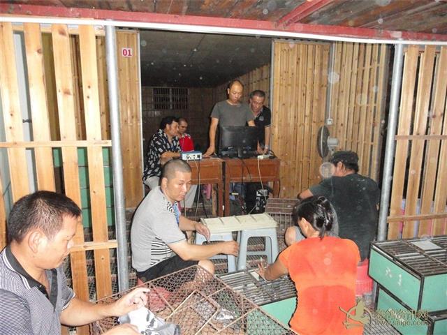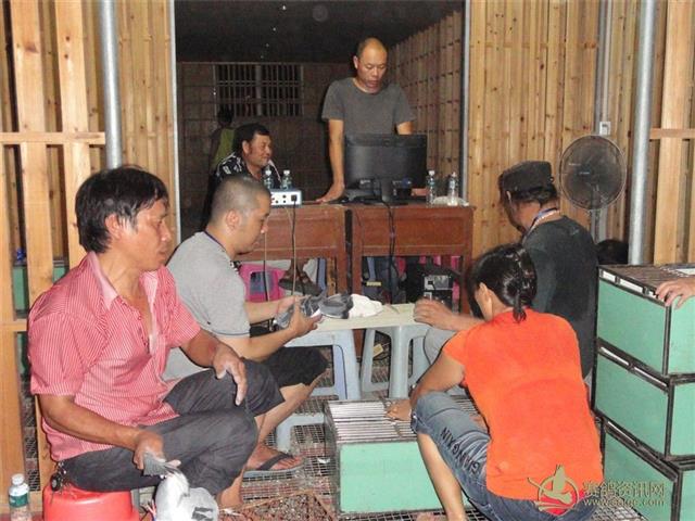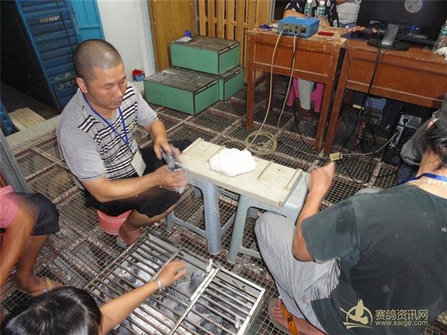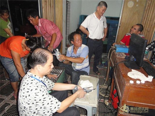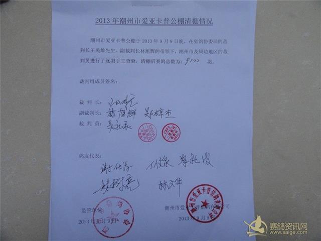潮州市爱亚卡普公棚于2013年9月9日晚,在省鸽协委派的裁判长 王民雄先生、副裁判长林旭辉的带领下,潮州市及周边地区的 裁判员进行了逐羽手工查验,清棚后赛鸽总数为:9100羽。
