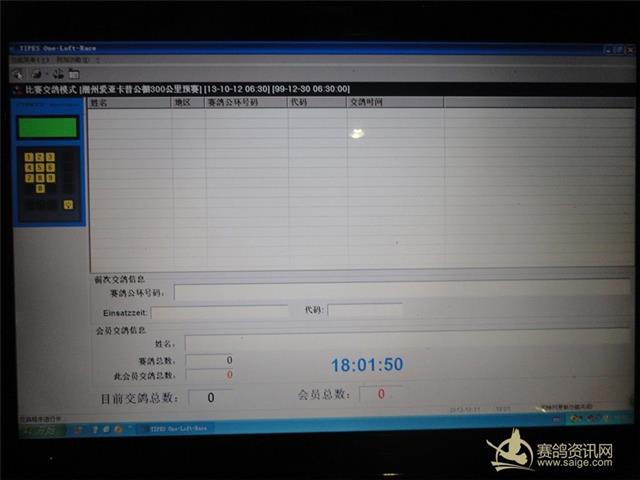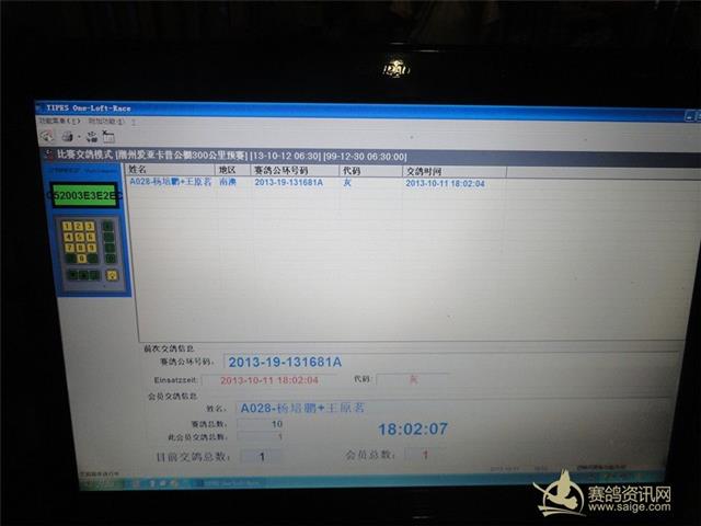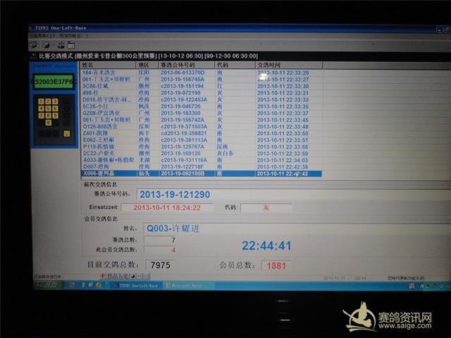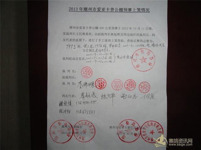 2013年潮州市爱亚卡普公棚预赛集鸽已于2013年10月11日晚,受裁判长王民雄委托,由副裁判长林旭辉会长及周边地区的裁判员、鸽友代表监督下,进行手工逐羽上笼查验,查验后赛鸽总数为7975 羽。实上笼7974羽,其中环号:2013-13-123384 雨 撞伤失去飞行能力,退回鸽主。 足环号: 2013-19-121290 灰 ; 足环号: 2013-19-122718 雨 ; 足环号:2013-19-092100 雨 以上3羽赛鸽因电子环损坏,即重新配置新电子环。 鸽友代表:( 潮州)谢昭煌 手机:13539391555 (澄海)林波阳 手机:15816753111