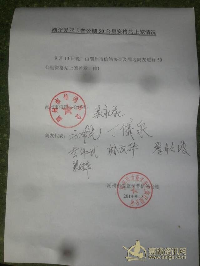 潮州市爱亚卡普公棚于9月13日晚,由潮州市信鸽协会及周边代表进行了50公里资格站上笼集鸽盖章工作! 以下为集鸽图片: