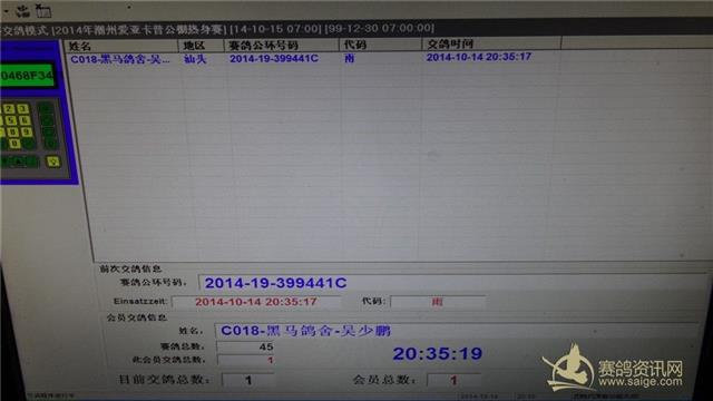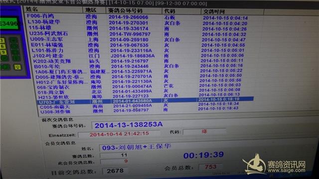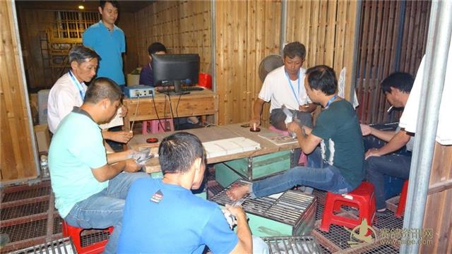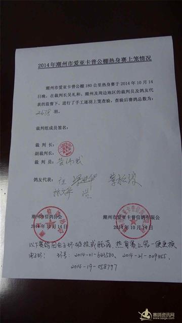 潮州市爱亚卡普公棚热身赛于2014年10月14日晚,在省鸽协委派的裁判员吴礼和先生的带领下,潮州市及周边地区的 裁判员进行了逐羽手工查验上笼,经查验上笼赛鸽总数为:2678羽。