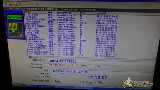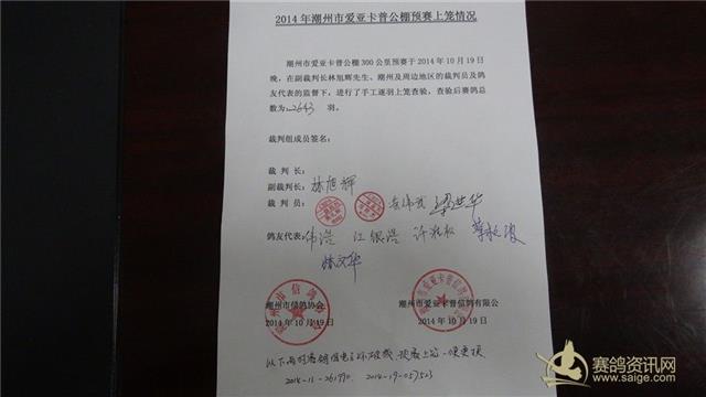 潮州市爱亚卡普公棚预赛于2014年10月19日晚,在省鸽协委派的副裁判长林旭辉先生的带领下,潮州市及周边地区的裁判员进行了逐羽手工查验上笼,经查验上笼赛鸽总数为:2643羽。