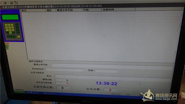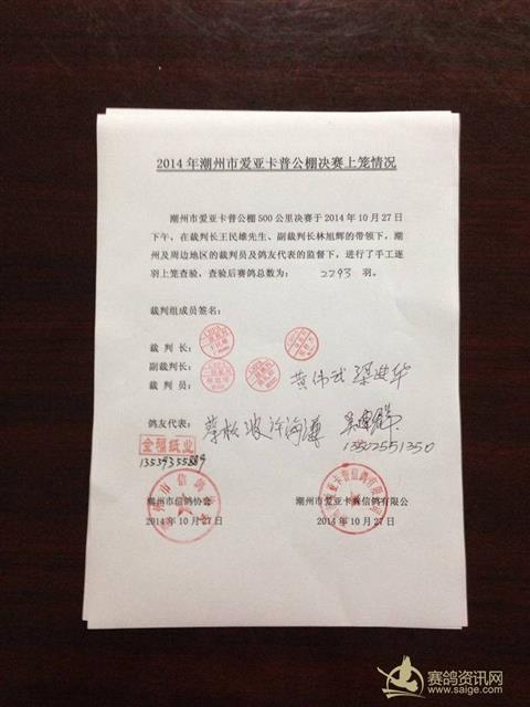 潮州市爱亚卡普公棚决赛于2014年10月27日,在省鸽协委派的裁判长王民雄先生的带领下,潮州市及周边地区的裁判员进行了逐羽手工查验上笼,经查验上笼赛鸽总数为:2293羽。