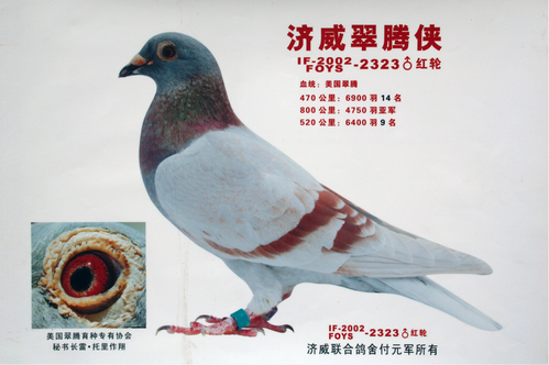 翠腾137的 名字来源是这样的:有一位纽奥克球会的球员,准备到罗撤撕特去比赛,我请他顺便带几羽我的鸽子到罗撤撕特去做路训,他答应了,但却在火车上遇到住在纽泽西洲,翠腾镇的鸽友哈挈先生,哈挈很喜欢蓝中的一羽鸽子,我这位球员朋友,也慷慨的卖给他,当然我没收到分文,一年后,哈挈停止养鸽,凭者我在鸽翼上所盖的地址,与我联系上 ,并答应以原价2块半美元,回售给我,我汇上款项,取回鸽子,它是一羽红斑公,环号137,由于从翠腾镇购会,所以我用地名替它命名为翠腾137,琥珀色的鸟啄,白脚趾,珍珠眼,羽毛粗宽,肛骨坚强,大鼻头,中等体形,平衡感强,龙骨长,腿中长有力,在鸽群中,有如鹤立鸡群,一眼就会被鸽友相中,它最远的竞翔距离是75英里(120公里),主要是育种的能力.我将它与白眼母(BrightEye)相配对. 白眼636黑斑白羽母,有耀眼的翔绩,最有名的是10洲500英哩(800公里)联合赛,参赛鸽子11,000羽“白眼”是唯一当天归返的鸽子。它的父亲是奥拂曼的“纽奥克老板”500英哩银环得主,母亲红斑,是翠腾137的全姊妹,因此翠腾137与白眼是近亲的配对。除了137与636的配对外,我还有另一组好配对“银色司令”与“佛罗伦斯少女”这对鸽子,育出了纽约州第一羽500英哩当日归反鸽,我不断的交叉配对这二组鸽子的后代,建立起美国第一个超强鸽系…翠腾系 翠腾137与白眼636的后代,几乎什么羽色都有,灰、灰斑、银色、红斑,有的有白羽、有的有红花,但羽色并不影响它们的竟翔能力,直子女有25羽500英哩当日归返鸽,在当时我还不富有,但我确拒绝了750美元欲购此配对的天价,这对种鸽在我的鸽舍14年,从没有劣质后代。1898年9月4日,晚上11:30,我隔壁的工厂爆炸,火势迅速的蔓延到我家,我的鸽舍,这场大火摧毁25间房子,烧伤100多人,也夺走了我全部300羽鸽子的生命,包括翠腾137,白眼636。我第一次参加鸽子比赛是1888年,在属于国际赛鸽联盟的纽奥克第五赛鸽支会,当时我只有17岁,并没有养鸽经验,支会会长,因为怕我的鸽子到处散步,带慢别的选手鸽影响比赛成绩,拒绝我参赛幸好国际赛鸽联盟主席马洛先生强迫他们接受我参加比赛,我才有机会,支会会长对此决定相当火大,当场踢翻我的鸽笼,并决定我的鸽子不能和其他会员的鸽子一起施放,必须等所有比赛鸽子飞出半小时后,我的鸽子才能放飞。这是一场300英哩(480公里)的比赛,我的3羽鸽子,诺贝尔,凯撒,拜莫,却以1417码的分速,超前所有支会的鸽子半小时归返,前后共赢的了他们1个小时,但支会会长,以不是同时施放为由,拒颁冠军奖杯给我,最后还是马洛主席再度出面,为我讨回公道。 第二次比赛的距离是443英哩(708公里),我的鸽子同样的不能与其他人的一起施放,上次是30分钟,这次是45分钟之后,翠腾137的直子,灰斑“诺贝尔”,领先其他鸽子45分钟,当日归返,加上晚放的45分钟,共计领先1个半小时,支会会长认为不可能,取消比赛结果,重新比赛一遍,“诺贝尔”再次领先45分钟,以实力封住那些老板顽固的嘴。1888年的500英哩比赛,我并没有好的表现,次年我离开纽奥克第五支会,与伯纳德共组纽泽西支会和他们抗衡,1889年的500英哩比赛,翠腾137的直孙女“阿拉巴马”领先群鸽9小时,轻易的取得联合冠军。接着我们向领近的3个鸽舍,纽奥克支会,布鲁克林支会,王国支会挑战200英哩幼鸽赛,赌注是输的支会,请赢的支会所有会员吃一顿晚饭。 我们的支会在一次路训中,遇到大雨,几乎全军覆没,其他三个支会的会员得到的消息后,认为有机可乘,竟然提出每会下注50美元的要求,我们的会长召开紧急会议,希望取消比赛,我反对临阵退缩,并请求由我独自应战,我还剩5羽幼鸽,虽然都不足6个月大,但状况良好,为了让大家安心,我做了一次175英哩的路训,并请所有会友到我家等鸽子,这5羽幼鸽以分速1670码的高速一齐回来,会长决定斗争到底,大家也纷纷解囊凑足50美元睹金。比赛日,天气相当差,马贺鸽合的5羽鸽子以分速900码,同时归来,赢得比赛。这5羽鸽子在后来都有好的表现,尤其“丹尼尔”1054红斑公,更是出色,计得15张奖状以及全美100到500英哩平均速度冠军。每次比赛都是当日归返。 (未完待续)