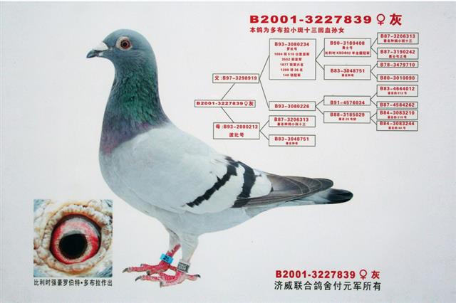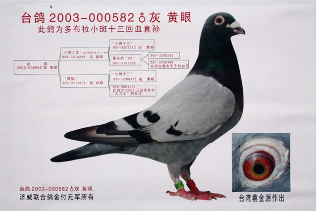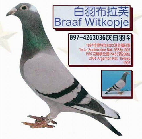 说起多布拉鸽舍,一定要提起一羽依然在世却已缔造传奇,对比利时远距离赛造成重大冲击的鸽子,它的名字是"小斑13号"(Klein Geschelpt 13)。在当今,论起赛绩和育种能力兼得的超级名鸽中,多布拉父子鸽舍的"小斑13号"堪称鸽中之王! 世纪种雄"小斑13号" 多布拉在远距离赛的杰出表现令人景仰。多布拉先生本人话不多,但是他的鸽子会说话──它们用成绩来帮主人说话,也因为翔绩是如此出色,使得多布拉成为大家近年来争相想打败的长距离对手。 多布拉由饲养史翠特鲍特系的狄贝斯(De Baes)那里购得"小斑13号"的父亲。狄贝斯是那些成绩惊人却没没无闻的众多鸽友之一。"小斑13号"的母亲是来自胡特克(Houtekiet)的诺尔.派仁(Noel Peiren)血系鸽。这个血系有多好,每个比利时鸽友都清楚。"小斑13号"(De Klein Geschelpte 13,B87-3206313),它打开了多布拉鸽舍的童话色彩,主要是它这羽鸽子造就多布拉鸽舍的名声如野火燎原般迅速传开。"小斑13号"的体型十分娇小,而且平衡感非常好,一双眼睛会说话,散发出"智能"的光芒。由于它具有这些特质,所以多布拉决定试试它的子女。之后他发现自己犯下滔天大错,竟然没让它早点多育种,幸好时犹未晚!"小斑13号"是一羽好飞将,育种成绩亦从未屈居第二。1987年生的"小斑13号"虽然年岁已大,育种能力依然不输给年轻种鸽,堪称老当益壮的典范。 "小斑13号"的子女在竞翔方面的成绩远超过它们的父亲,育种成绩亦强过父亲。研究多布拉最近最佳赛将的血统表后,发现它们的表现一代胜过一代。 子代青出于蓝 "小斑13号"是一羽中距离鸽,但它的后代比较擅飞长距离赛,远至巴塞隆纳(超过1000公里)。它最有名的一羽儿子是"诺亚号"(Noel,B90-3180408),1992年,它成为全国鸽王冠军。成为一个全国有 8 万名鸽友的国家里最好的鸽子。"诺亚号"(90-3180408)亦遗传到父亲的育种能力,作出下列优异赛鸽和种鸽的父亲: "火箭号"(Raket,93-3080101),1998年全国远距离鸽王 8 位,1999年黑池奥林匹克冠军。"罗比"(Robby,93-3080234),波提尔3552羽亚军,后不幸迷飞。"托纳多"(Tornado,93-3189976),2000年亚精顿全国一岁组冠军鸽之父。多布拉鸽舍基础种鸽之一。"小斑13号"另一羽杰出的鸽子是"大力士"(Herkull)B92-3153113,牠是"诺亚号"的半兄弟,更是1996年KBDB全国鸽王3位,且赢获卡奥尔全国9043羽 3 位,拿邦全国6092羽 4 位等等奖项。它的同孵鸽"布瑞吉"(Blacky,92-3153114)也不让兄长专美于前,缔造布瑞福全国4931羽3位的优秀成绩。 不只雄鸽翔绩令人称奇,"小斑13号"的女儿和孙女们同样巾帼不让须眉。牠的直女"卡密诺"(Camino)98-3001259是典型的超级种母,它是苏雅克全国7154羽30位,卡奥尔全国9989羽40位,以及布瑞福半全国6793羽59位奖鸽的母亲。 另一羽直女"贝莉"B96-3288582则作出2000 年亚精顿全国冠军。 直孙曾孙超级鸽辈出 "小斑13号"繁殖力超强,很快便建立起一个庞大又实力雄厚的王朝,且优势遗传在第3代、第4代仍持续发威,例如孙辈的杰出鸽多不胜数,例如:"火箭号" B93-3080101获1999年黑池奥林匹克冠军、"罗比"B93-3080234是波提尔3552羽亚军、"托纳多"B93-3189976作出亚精顿全国赛一岁鸽组冠军、"伊果斯"B95-3220875查特路联省赛7841羽15位、"雷克斯"B97-3213019获得1999年苏雅克全国6035羽冠军、"法宾号"B98-3001340获KBDB长距离鸽王西法兰德省11位......等等。 第4代更是超级鸽辈出,例如"快捷"B96-3074156获1997年拿邦省赛3092羽15位、"海力欧"B96-3308059荣获1999年KBDB鸽王亚军、"佛力特"B97-3213036获苏雅克全国6035羽8位、"达克斯号"B99-3111842获达克斯国际12176羽5位。 父子席卷达克斯 在2002年达克斯国际赛,布拉父子大放异采,囊括国际冠军、3位。冠军得主克利斯.多布拉是罗伯.多布拉独子,6年前始建舍独立参赛,今年更在达克斯国际赛青出于蓝,勇夺国际冠军。老多布拉表现也毫不逊色,获得国际3位,见到儿子独立参赛后的杰出表现,老多布拉为后继有人感到欣慰不已。 这羽国际冠军鸽环号B00-3135594,分速1019.83公尺,它是多布拉鸽舍的镇舍之宝"小斑13"曾孙,也是1992年KBDB长距离鸽王"诺亚号"直孙。至于国际3位鸽B00-3135549(和冠军鸽环号正好后两位数字相反),则是"小斑13"外孙,由"小斑13"直女配卡士顿的波城全国冠军鸽作出。 年轻的克利斯用他太太的姓氏派瑞特.多布拉(Pareit Dobbelaere)使翔(他的名字已和老多布拉注册共享一个鸽舍),新鸽舍在建立短短几年内即获得国际赛冠军令人羡慕,但仔细研究国际赛冠军鸽的血统,1/4是1992年KBDB长距离鸽王(内祖父),1/4是1998年KBDB长距离鸽王8位的母亲(内祖母),1/4是布瑞福21012羽全国亚军的父亲(外祖父),1/4是布瑞福21012羽全国冠军的母亲(外祖母),这样显赫的身世,得奖绝非侥幸,"铭鸽来自铭血"果不其然。 强将手下无弱兵,多布拉父子鸽舍自1992年窜起,称雄比利时长距离鸽坛十年,如今父子更分进合击,扬威达克斯再创高峰,正是长距离名舍,长距离名鸽;名鸽创造名舍,名舍再造名鸽,互相依赖,生生不息。