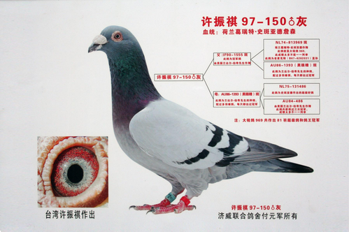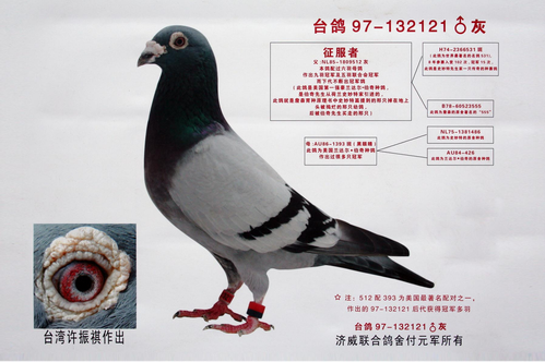 NL85-1809512征服者 灰(♂) 父:NL74-2366531母:B78-6052555 父鴿比賽8年入賞102次,15次聯合會冠軍。北美(美國、加拿大、墨西哥)最強鴿舍,入賞北美賞一年一度排行獎40次以上,總冠軍3次,蘭達爾.伯奇鴿舍最佳種鴿。本鴿一進口次年就作出比賽,共得6羽地區冠軍,5羽聯合會冠軍,往後只作為留種鴿,再作出更多冠軍下代。全美各地均發揮,是全美最出名的種鴿。1994年由本舍高價購入,下代在台灣海陸皆得過綜合冠軍,上代在歐洲有2隻入賞冠軍23次,6隻奧林匹克代表鴿。本血統可飛到800公里,兄弟中就有長距離鴿王NL85-8563579鐵人號,在1989年長距離鴿王入賞43次;NL83-8386802獲得5次冠軍63次入賞。孫代鴿如荷蘭龐地羅莎的007,即是最近親繁殖的第三代,此血統下代在全世界均發揮中,即可知血統有多珍貴。
