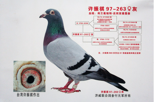 NL74-813969神奇969 斑(♂) 於荷蘭就已作出40多隻入賞鴿,包括數隻鴿王,其中有一直女於15000隻奧爾良全國賽隻中得總冠軍,超速4分鐘;售到美國又繁殖41隻好鴿,不是入賞就是留為種鴿,再作出入等鴿,也包括數隻鴿王,下代於世界各地皆發揮。
