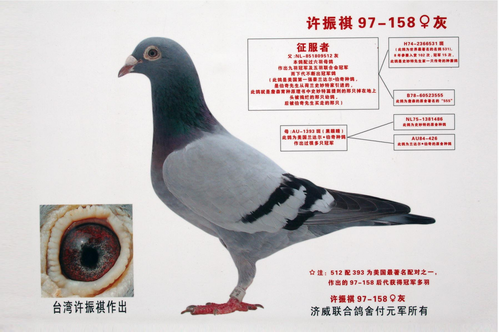 IF92-6822斑白羽(♂)征服者父鴿,比賽8年入賞101次,15次連盟冠軍。本配對是北美(加拿大、美國、墨西哥)第一強舍蘭達爾‧伯奇作出。種 鴿在美國已作出許多冠軍鴿。伯奇共入一年一次北美獎40次以上,總冠軍三次,第二名成績就不及一半,可見有多強。而這 些超級種鴿也只有在台灣高額獎金下,才值得投資,而且證明是超值。該舍80%以上種鴿為本舍所收藏。下代作出冠軍:◎北海冠軍號(2000-175878斑白羽♂)為IF92-6822之孫,2000年永和北海春四關綜合冠軍,殘存9隻,1629隻報鴿。作翔:林泳鎮、劉富淦,種鴿:許振祺。◎永靖冠軍號(96-079101斑♀)為IF92-6822之孫,96年冬彰化永靖五關綜合冠軍,下代又有多隻綜合入賞鴿,1500報鴿。作翔:唐政雄,種鴿:許振祺。