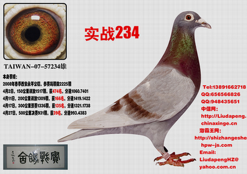 本人是一名普普通通的工薪阶层鸽友,由于微薄的收入只能养一些价格低廉的天落鸟台鸽。为什么要养台湾人的天落鸟呢?而不养大陆本地的天落鸟呢?因为本人通过观看大量台湾信鸽资料、通过与台湾鸽友真诚的交流,认为这些天落鸟中,不乏有很多优秀品系。为了给自己引进的天落鸟台鸽一次比赛的机会,证明它们在海上飞过激烈的五关赛后所作出的仔代还能参加多关比赛、还能飞出好成绩。所以本人不在本地协会打比赛,主打公棚赛。并且就用能查到比赛成绩,真正飞过五关赛的精品天落鸟相互配对作仔打比赛,介绍一对精品台鸽并且附上仔代比赛的成绩,请鸽友指点。目地就是想拿不说话的“成绩”,来证明天落鸟里有------好鸟! 介绍一点台鸽资料给鸽友看看------台湾省由于特殊的地理环境,造就了海上多关赛。其赛况之激烈、奖金之庞大与欧洲列强相比有过之而无不及。台湾鸽赛的奖金很高,有的高达人民币数千万元,有的鸽赛已变成赌赛,吸引一些人养鸽参赛.从各种媒体报道中我们可以看到这些名鸽后代在台湾省多关赛中,经受残酷的淘汰,也取得了优异的赛绩,可见我国台湾省赛鸽界的赛鸽高手的育种水平、竞赛水平很高。从另一方面,也告诉我们台鸽血统的珍贵性。每年有数以百万计的赛鸽在竞赛中掺遭淘汰,可以说台鸽具有世界超一流水准。 我家台鸽以天落鸟为主渠道,因台湾和福建仅一水相隔,空距250公里,由于人为事故和气候突变等原因,每年有数千羽台鸽迷途落在福建沿海地区和船上。台鸽迷途原因很多,因在旅途中颠簸、疲惫;在笼中又被强者所欺而饥渴,心神不定而引起意外迷途和落足。尤其汽车运输旅途中过分颠簸,头部碰击铁笼,头脑发晕,而且产生皮下出血,影响视神经,瞳孔放大,无法依光线强弱而伸缩,有的要几天才能恢复原有的伸缩性,所以这时期失鸽较多。 受高空大气流的突然袭击,特别是在海洋中,被冲击到较边远地区,信鸽体力下降被迫着陆,或栖在大海航行的船上等等。