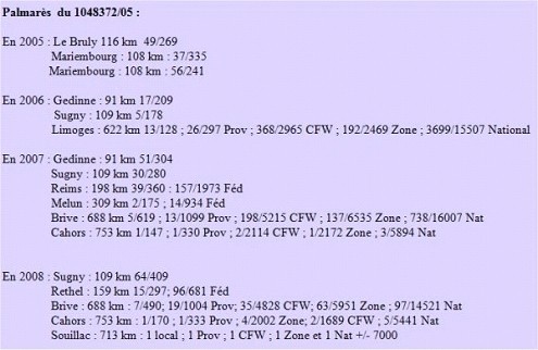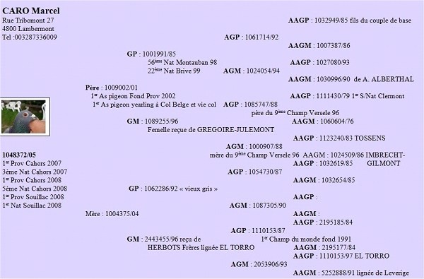 冠軍鴿為一羽3歲灰班公鴿(B05-1048372),除獲得比利時2008年K.B.D.B.全國長距離鴿王賞冠軍外,亦贏得蘇雅克全國賽冠軍。