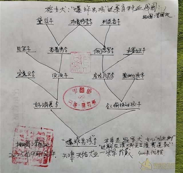 赛鸽和赛狗之间的近亲育种方式,是不是相通的? 李国双 跨界研究动物之间(赛鸽和赛犬)近亲育种的方式,是不是相通的? 喜欢鸽子,也喜欢狗。 以前就发现国外斗狗也搞近亲育种,有的冠军狗还是多次近亲交配作出的,包括很多业内知名的名犬。 去年还画了多张这些冠军斗狗的近亲育种血线图,发现和赛鸽的近亲育种血线图很相似,但是我并没有发布到网上。 几天前,浏览《天津天佑犬业--宋军》发布的格力犬的比赛视频。 “龙血树”母犬,近期在澳大利亚吉隆赛道获得400米优胜。这个母犬也是多次近亲交配做出的,他的父亲就是“爆炸男孩儿”,也是一只冠军狗,被天津天佑犬业收藏。 “爆炸男孩”是顶级种公犬“布雷特·李”(老布),多次近亲做出的。 朋友们看了上面这个图,发没发现和某些大名鸽的近亲育种方式很相似呢?!