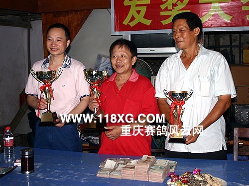获奖的鸽友(左)亚军-曹斌、(中)冠军-周育明、(右)季军-罗万顺