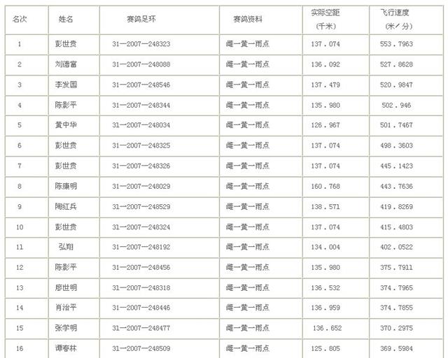 比赛项目:150千米 参赛羽数:678羽 当日天气:阴天 司放地点:南充 司放时问:2007—10—20 09:40 当日风向:无风 司放地经纬:1060256.00/304403.00 归巢时间:2007—10—20 当日风力:1级 制表:2007年10月20日