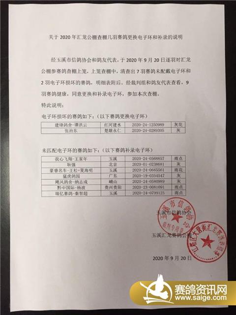 关于2020年汇龙公棚查棚几羽赛鸽更换电子环和补录的说明