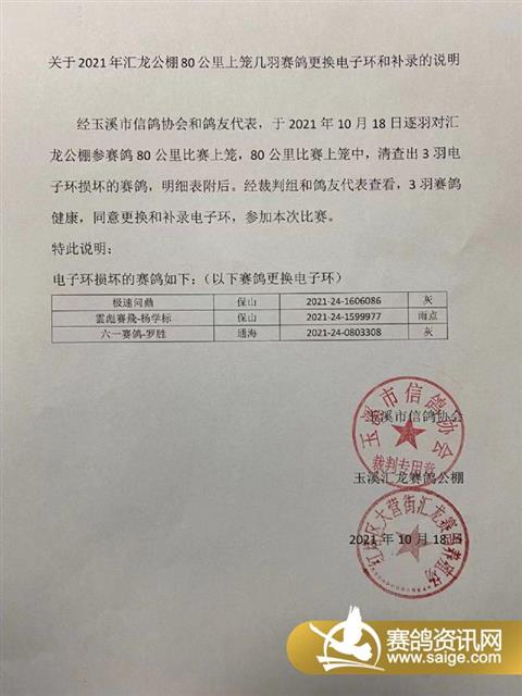 关于2021年汇龙公棚80公里比赛几羽赛鸽更换电子环和补录