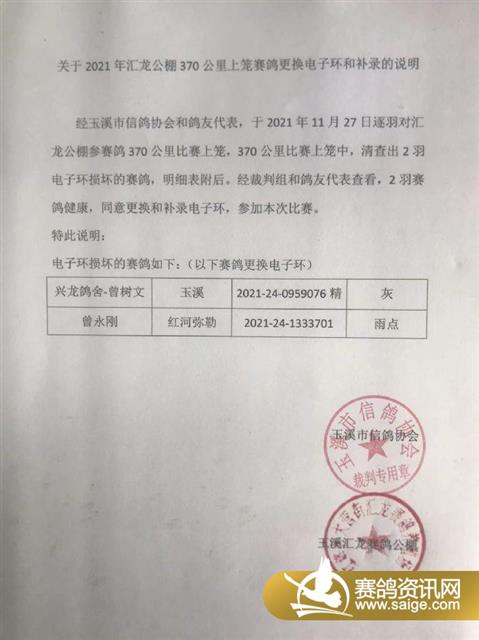 关于2021年汇龙公棚370公里比赛几羽赛鸽更换电子环和补
