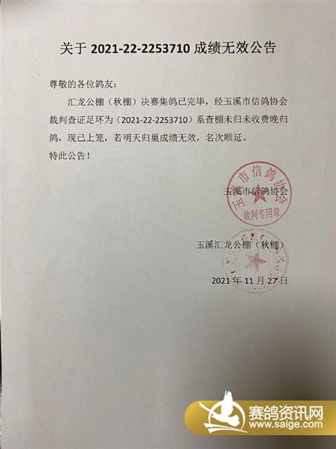 汇龙秋棚:关于2021-22-2253710成绩无效公告