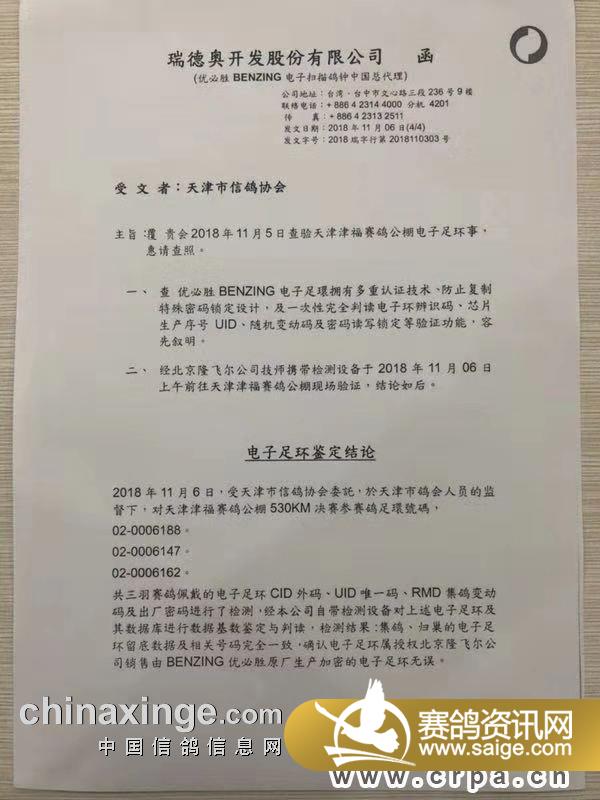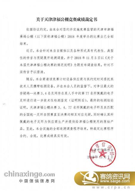 天津市信鸽协会关于天津津福公棚竞赛成绩裁定书 2018年11月6日,天津市信鸽协会领导、裁判及隆飞尔扫描系统工作人员到达津福公棚。分别对津福公棚2018赛事536公里决赛获奖鸽季军、4名及77名从437公里预赛上笼至536公里决赛归巢依次检查校对赛鸽印章、足环和电子环UD密码,并出具以下裁定书。