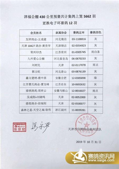 津福公棚430公里预赛集鸽上笼清单 津福公棚430公里预赛共计集鸽上笼5662羽